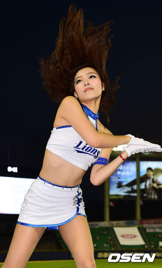 28일 오후 서울 잠실야구장에서 열린 '2014 한국야쿠르트 세븐 프로야구' 두산 베어스와 삼성 라이온즈의 경기, 삼성 치어리더 이수진이 무대 위에서 화려한 공연을 펼치고 있다.