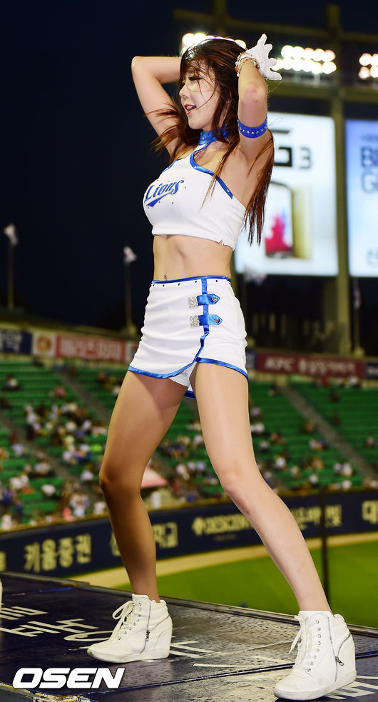 28일 오후 서울 잠실야구장에서 열린 '2014 한국야쿠르트 세븐 프로야구' 두산 베어스와 삼성 라이온즈의 경기, 삼성 치어리더 이연주가 무대 위에서 화려한 공연을 펼치고 있다.