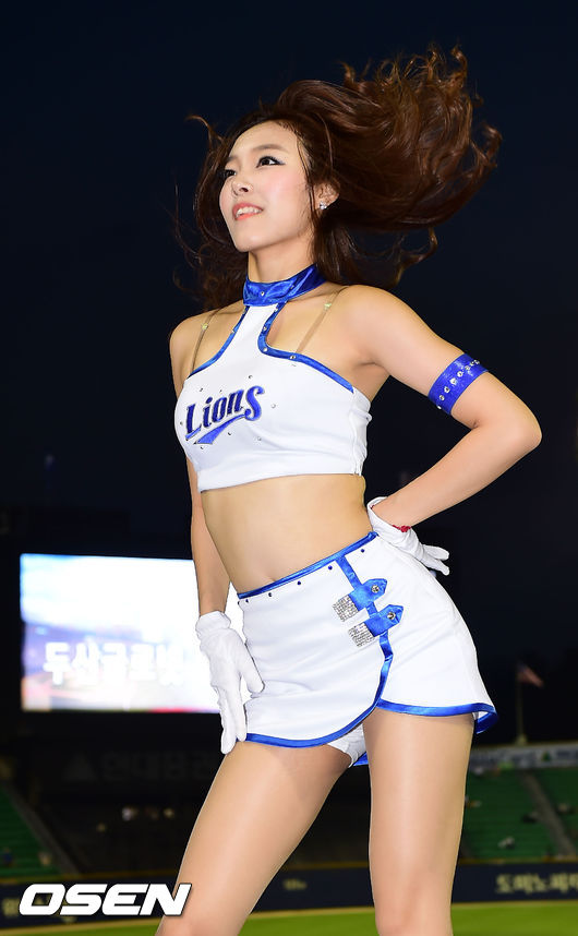 28일 오후 서울 잠실야구장에서 열린 '2014 한국야쿠르트 세븐 프로야구' 두산 베어스와 삼성 라이온즈의 경기, 삼성 치어리더 이수진이 무대 위에서 화려한 공연을 펼치고 있다.