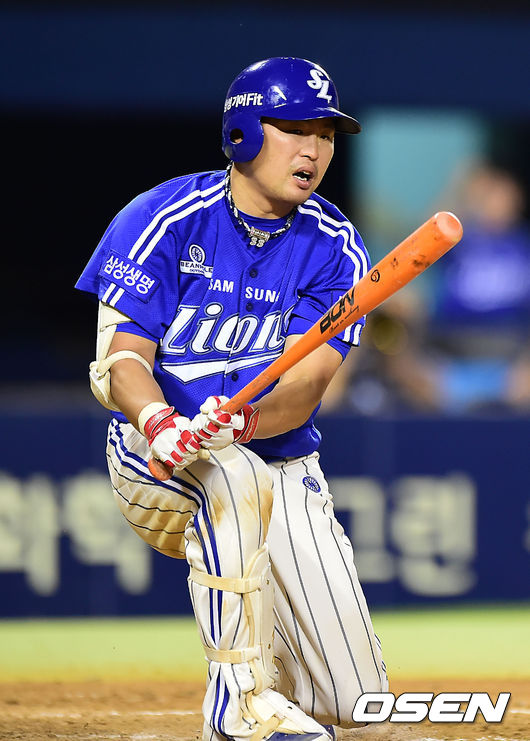 28일 오후 서울 잠실야구장에서 열린 '2014 한국야쿠르트 세븐 프로야구' 두산 베어스와 삼성 라이온즈의 경기, 5회초 1사 주자 2,3루 삼성 박한이가 타석에서 헛스윙 하며 삼진아웃을 당하고 있다.