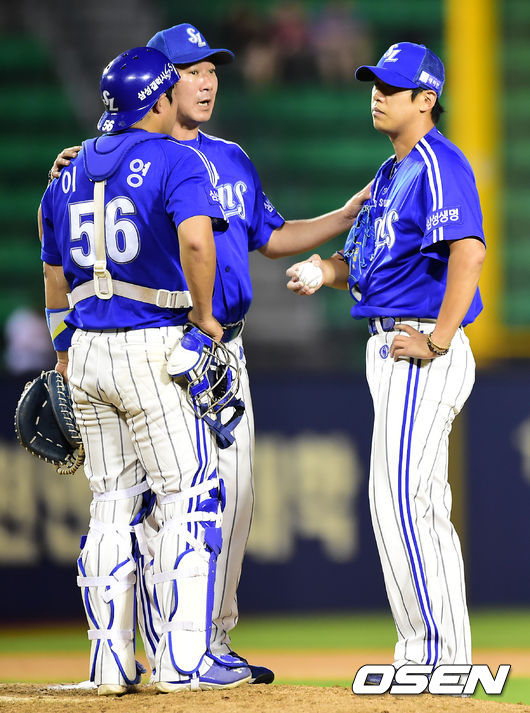 28일 오후 서울 잠실야구장에서 열린 '2014 한국야쿠르트 세븐 프로야구' 두산 베어스와 삼성 라이온즈의 경기, 5회말 무사 주자 1,3루 두산 칸투 타석에서 마운드에 오른 삼성 김태한 코치가 삼성 선발 윤성환과 말을 하고 있다.