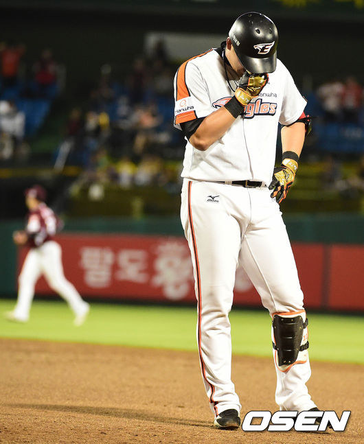 28일 대전야구장에서 벌어진 '2014 한국 야쿠르트세븐 프로야구' 한화 이글스와 넥센 히어로즈의 경기,5회말 2사 1,3루 잘맞은 타구가 중견수 이택근에게 잡히자 김태완이 고개를 숙이고 있다.