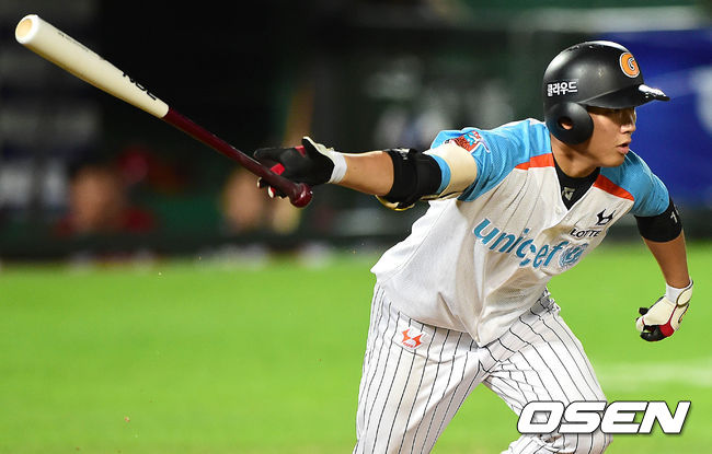 5회말 롯데 공격 2사 2루 상황 하준호가 적시 1타점 우전안타를 날리고 있다.