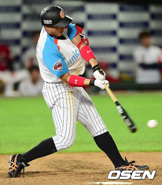 5회말 롯데 공격 2사 2루 상황 황재균이 적시 1타점 우전안타를 날리고 있다.