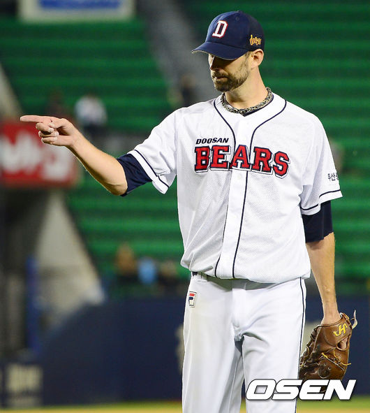 28일 오후 서울 잠실야구장에서 열린 '2014 한국야쿠르트 세븐 프로야구' 두산 베어스와 삼성 라이온즈의 경기, 6회를 마친 두산 선발 니퍼트가 사인을 보내며 덕아웃으로 향하고 있다.