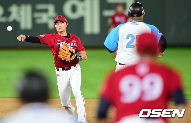 6회말 롯데 공격 1사 1루 상황 히메네스의 병살타 때 KIA 유격수 김민우가 주자 최준석을 포스아웃 시킨 뒤 1루로 공을 뿌리고 있다.