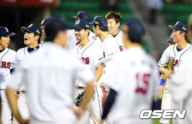 경기를 마치고 두산 선수들이 마운드 근처에 모여 승리의 기쁨을 나누고 있다. / rumi@osen.co.kr