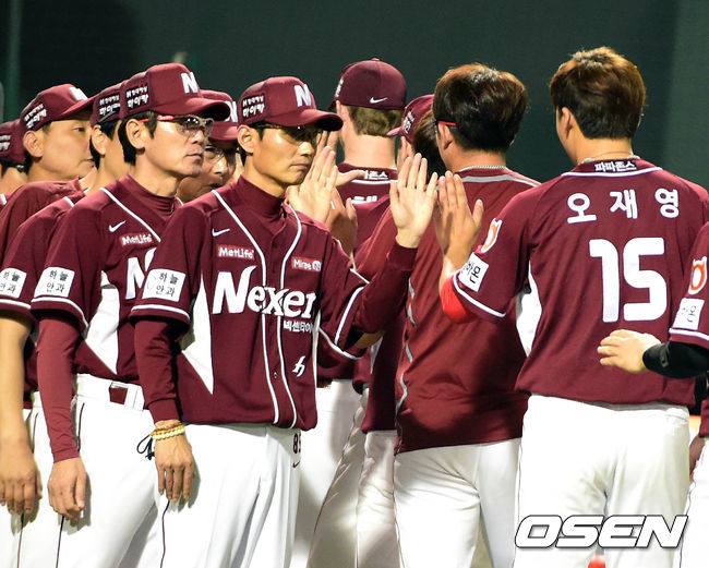 28일 대전야구장에서 벌어진 '2014 한국 야쿠르트세븐 프로야구' 한화 이글스와 넥센 히어로즈의 경기, 10-4로 승리한 넥센 염경엽 감독이 선수들을 반갑게 맞이하고 있다.