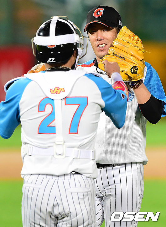 9회 마운드에 올라 삼자범퇴로 경기를 마무리지은 롯데 투수 김승회가 포수 용덕한과 인사를 나누고 있다./dreamer@osen.co.kr