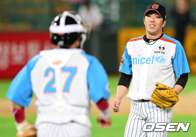 9회 마운드에 올라 삼자범퇴로 경기를 마무리지은 롯데 투수 김승회가 포수 용덕한과 인사를 나누고 있다./dreamer@osen.co.kr