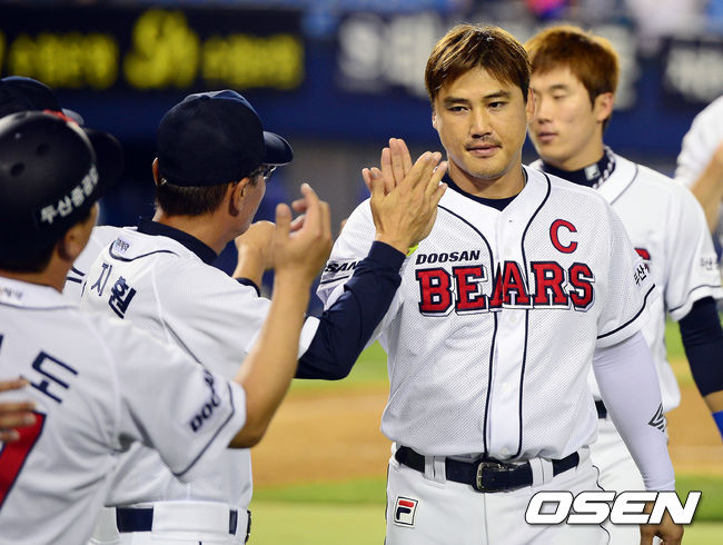 경기를 마치고 두산 홍성흔이 코치진들과 하이파이브를 하고 있다. / rumi@osen.co.kr