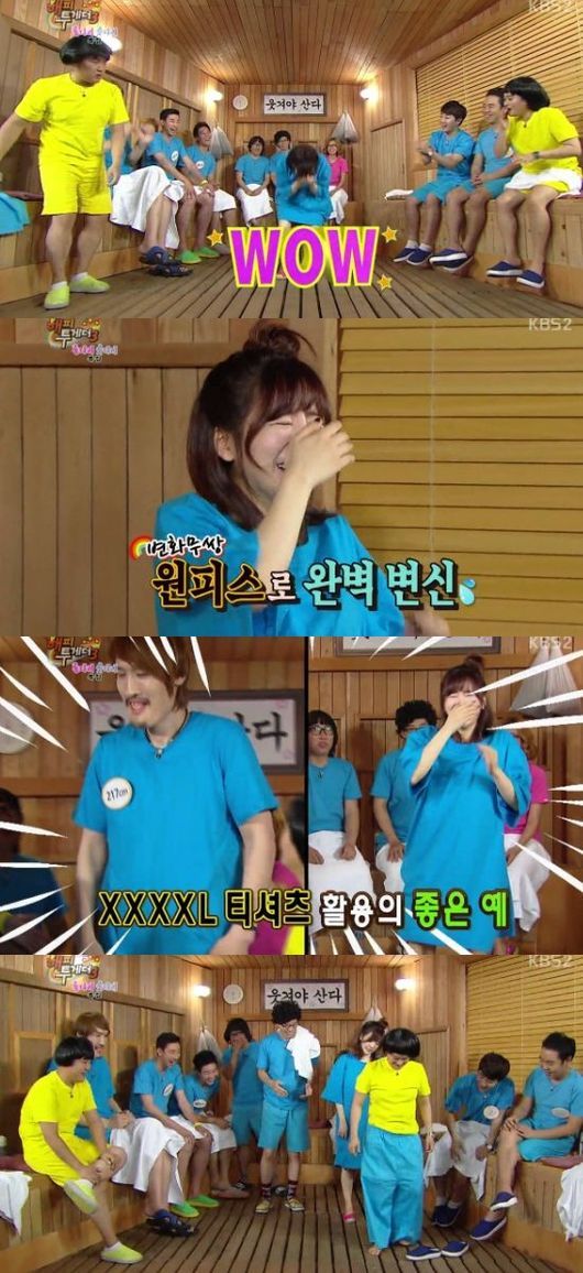 써니는 28일 오후 방송된 KBS 2TV '해피투게더3'에서 XXXXL 사이즈의 최홍만 티셔츠를 입고 이를 원피스로 변신시켰다.