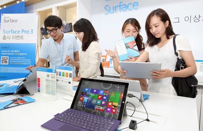 하이마트 잠실점에서 사용자들이 서피스 프로 3를 체험하고 있다. /한국마이크로소프트 제공.