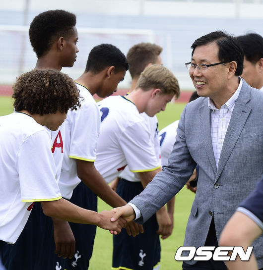 경기시작전 방금석 한국중등축구연맹 회장이 토튼햄 선수들과 격려의 악수를 나누고 있다.