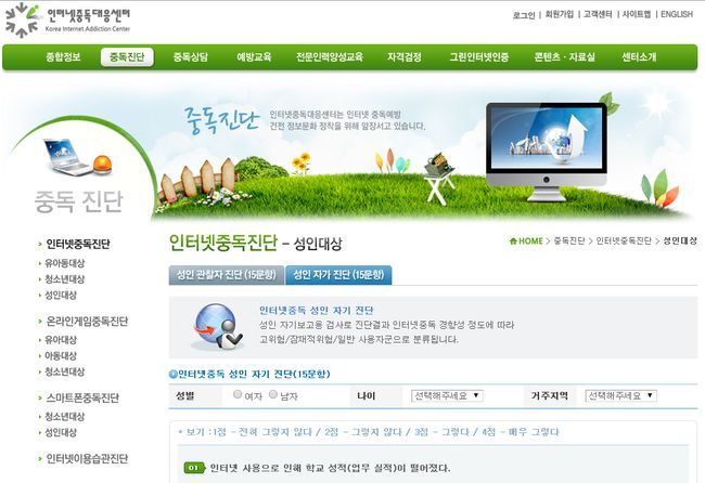 이는 인터넷 중독 대응센터 중독진단 페이지(http://www.iapc.or.kr/dia/survey/addDiaSurveyNew.do)의 간단한 테스트를 통해 인터넷 중독 여부를 확인할 수 있다.