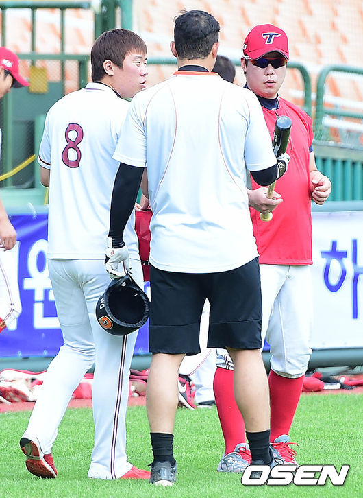 29일 오후 부산 사직구장에서 열리는 '2014 한국야쿠르트 세븐 프로야구' 롯데 자이언츠와 KIA 타이거즈의 경기를 앞두고, 롯데 황재균과 KIA 나지완-안치홍이 인사를 나누고 있다.
