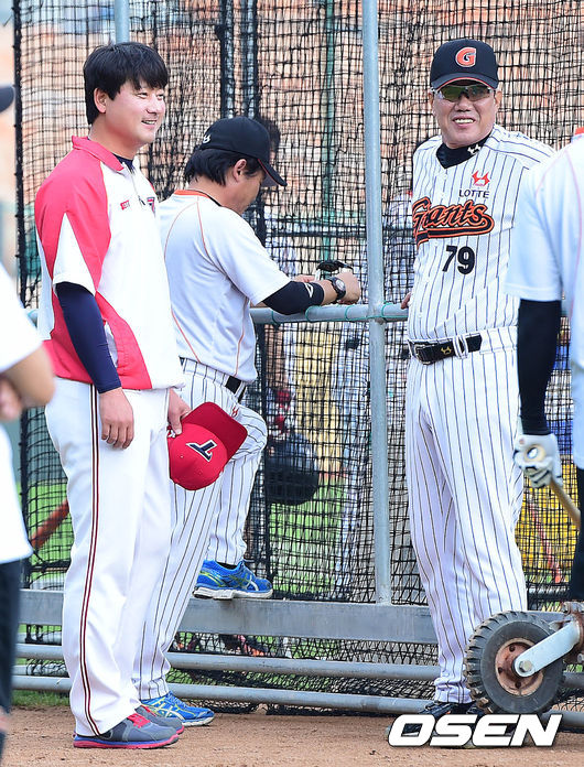 29일 오후 부산 사직구장에서 열리는 '2014 한국야쿠르트 세븐 프로야구' 롯데 자이언츠와 KIA 타이거즈의 경기를 앞두고, 롯데 김시진 감독과 KIA 최영필이 대화를 나누고 있다.