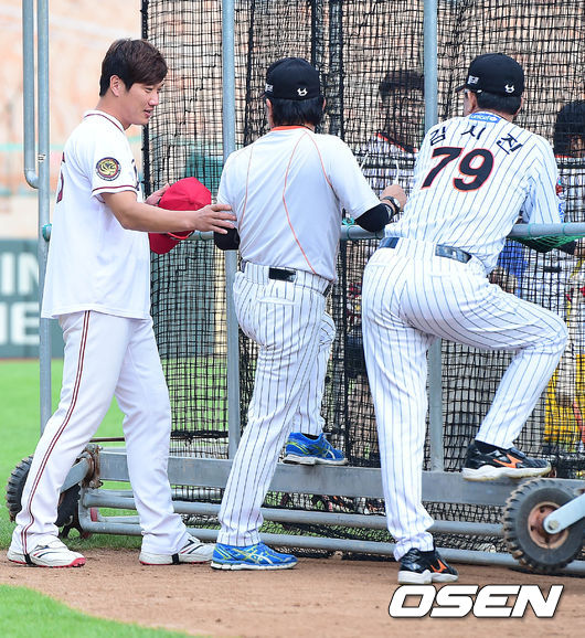 29일 오후 부산 사직구장에서 열리는 '2014 한국야쿠르트 세븐 프로야구' 롯데 자이언츠와 KIA 타이거즈의 경기를 앞두고, 롯데 박흥식 코치와 김시진 감독이 KIA 김주찬과 인사를 나누고 있다.
