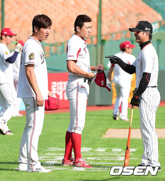 29일 오후 부산 사직구장에서 열리는 '2014 한국야쿠르트 세븐 프로야구' 롯데 자이언츠와 KIA 타이거즈의 경기를 앞두고, 롯데 공필성 코치와 KIA 김주찬-신종길이 인사를 나누고 있다.