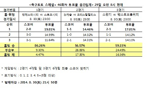 2014-15시즌 EPL 3경기 대상 축구토토 스페셜+ 46회차 투표율 중간집계 결과