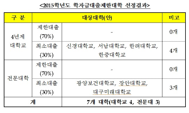 학자금대출제한대학과 경영부실 대학에 동시에 지정된 7개 학교는 신경대학교, 서남대학교, 한려대학교, 한중대학교, 광양보건대학교, 장안대학교, 대구미래대학교이다.
