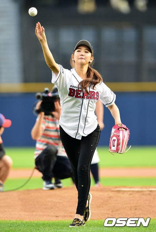 29일 오후 서울 잠실구장에서 열린 '2014 한국야쿠르트 세븐 프로야구' 두산 베어스와 삼성 라이온즈의 경기 시작전 이태임이 시구를 하고 있다.