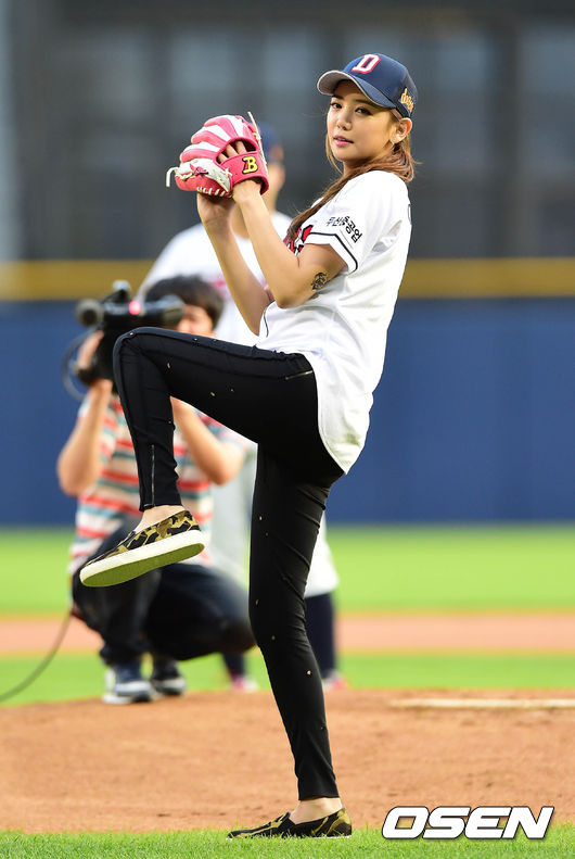29일 오후 서울 잠실구장에서 열린 '2014 한국야쿠르트 세븐 프로야구' 두산 베어스와 삼성 라이온즈의 경기 시작전 이태임이 시구를 하고 있다.