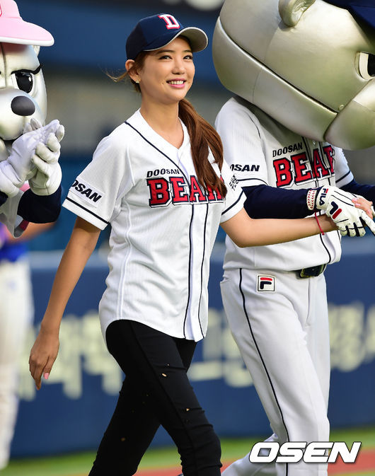 29일 오후 서울 잠실구장에서 열린 '2014 한국야쿠르트 세븐 프로야구' 두산 베어스와 삼성 라이온즈의 경기 시작전 이태임이 시구를 위해 그라운드에 걸어나오고 있다.