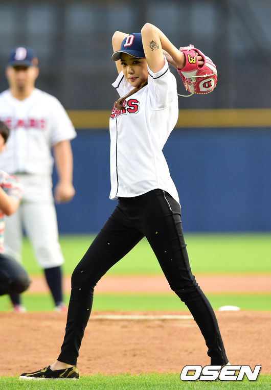 29일 오후 서울 잠실구장에서 열린 '2014 한국야쿠르트 세븐 프로야구' 두산 베어스와 삼성 라이온즈의 경기 시작전 이태임이 시구를 하고 있다.