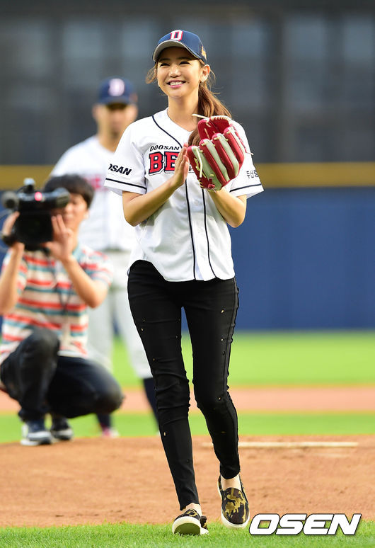 29일 오후 서울 잠실구장에서 열린 '2014 한국야쿠르트 세븐 프로야구' 두산 베어스와 삼성 라이온즈의 경기 시작전 이태임이 시구를 하고 미소를 짓고 있다.