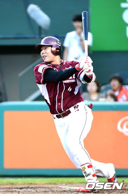 28일 대전야구장에서 벌어진 '2014 한국 야쿠르트세븐 프로야구' 한화 이글스와 넥센 히어로즈의 경기, 1회초 2사 1,2루 강정호가 1타점 적시타를 치고 있다.