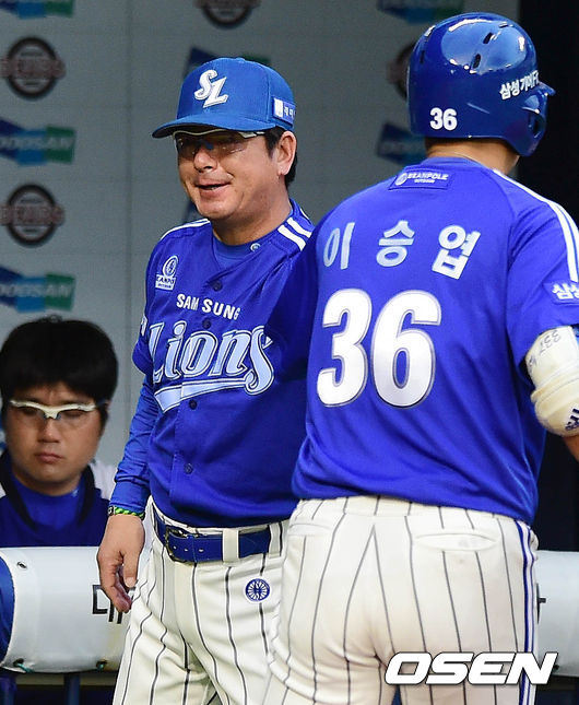 29일 오후 서울 잠실구장에서 열린 '2014 한국야쿠르트 세븐 프로야구' 두산 베어스와 삼성 라이온즈의 경기 2회초 1사 이승엽이 솔로홈런을 치고 류중일 감독과 하이파이브를 하고 있다.