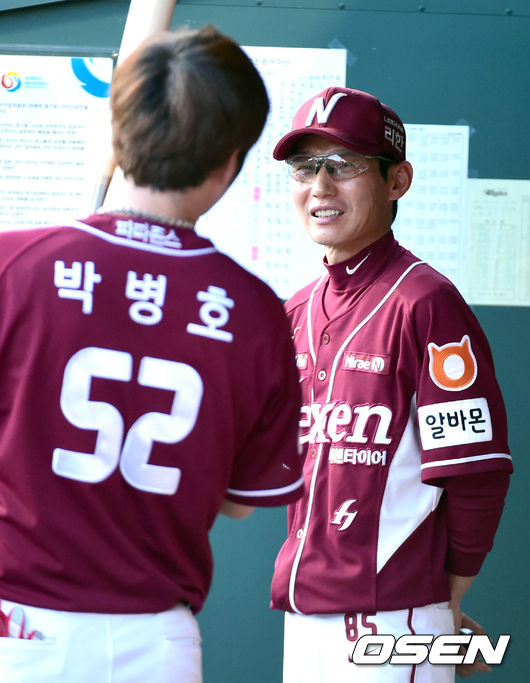 28일 대전야구장에서 벌어진 '2014 한국 야쿠르트세븐 프로야구' 한화 이글스와 넥센 히어로즈의 경기,염경엽 감독이 타석을 준비하고 있는 박병호와 이야기를 나누고 있다.