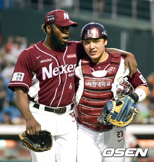 28일 대전야구장에서 벌어진 '2014 한국 야쿠르트세븐 프로야구' 한화 이글스와 넥센 히어로즈의 경기, 2회말 수비를 마친 소사가 박동원 포수와 어깨동무를 하고 이야기를 나누고 있다.
