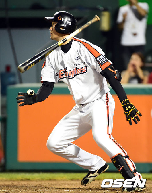 28일 대전야구장에서 벌어진 '2014 한국 야쿠르트세븐 프로야구' 한화 이글스와 넥센 히어로즈의 경기, 3회말 1사 송광민이 우측 담장 넘기는 솔로홈런을 치고 있다.