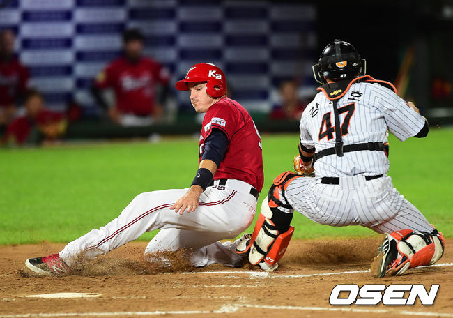 합의판정 끝에 세이프로 번복된 KIA 필의 홈 세이프 순간