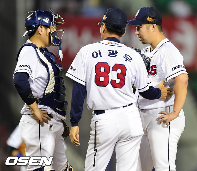 29일 오후 서울 잠실구장에서 열린 '2014 한국야쿠르트 세븐 프로야구' 두산 베어스와 삼성 라이온즈의 경기 3회초 2사 만루 양의지-유희관이 이광우 코치의 이야기를 듣고 있다.