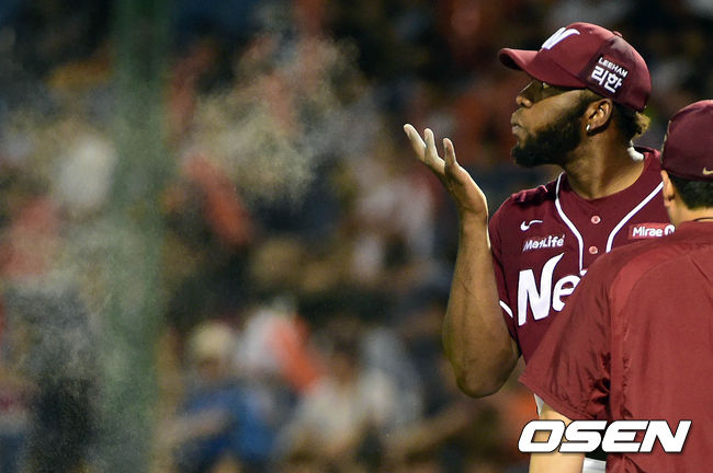 28일 대전야구장에서 벌어진 '2014 한국 야쿠르트세븐 프로야구' 한화 이글스와 넥센 히어로즈의 경기, 3회말 소사가 로진 가루를 입으로 불고 있다.