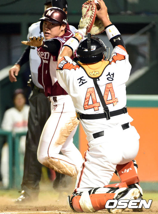 28일 대전야구장에서 벌어진 '2014 한국 야쿠르트세븐 프로야구' 한화 이글스와 넥센 히어로즈의 경기, 4회초 2사 2루 서건창의 안타때 문우람이 홈에서 아웃되고 있다. 합의 판정을 요구했지만 아웃.