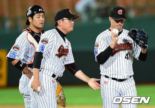 6회초 KIA 공격 무사 1, 2루 상황 롯데 선발 옥스프링이 마운드를 내려가고 있다.
