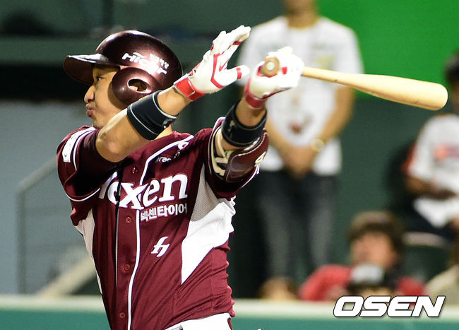 28일 대전야구장에서 벌어진 '2014 한국 야쿠르트세븐 프로야구' 한화 이글스와 넥센 히어로즈의 경기, 6회초 무사 1,3루 이택근이 주자일소 2루타를 치고 있다.