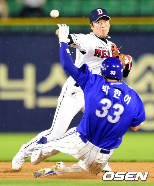 29일 오후 서울 잠실구장에서 열린 '2014 한국야쿠르트 세븐 프로야구' 두산 베어스와 삼성 라이온즈의 경기 6회초 무사 1루 최형우의 병살타를 허경민이 2루에서 박한이를 포스아웃 시키고 1루로 송구하고 있다.