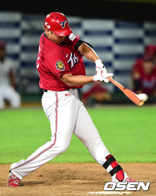 8회초 KIA 공격 선두타자로 나선 대타 김주형이 좌익선상 2루타를 날리고 있다.