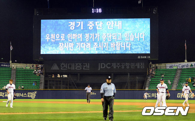 29일 오후 서울 잠실구장에서 열린 '2014 한국야쿠르트 세븐 프로야구' 두산 베어스와 삼성 라이온즈의 경기 6회말 종료 후 우천으로 인해 경기가 중단되고 있다.