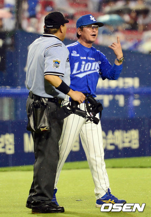 29일 오후 서울 잠실구장에서 열린 '2014 한국야쿠르트 세븐 프로야구' 두산 베어스와 삼성 라이온즈의 경기 6회말 종료 후 우천으로 경기가 중단되자 류중일 감독이 주심에게 항의하고 있다. 삼성은 두산에 한 점 차로 뒤지고 있다.