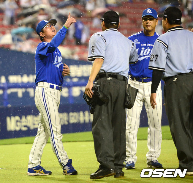 29일 오후 서울 잠실구장에서 열린 '2014 한국야쿠르트 세븐 프로야구' 두산 베어스와 삼성 라이온즈의 경기 6회말 종료 후 경기가 우천으로 중단되자 류중일 감독이 항의하고 있다. 삼성은 두산에 한 점 차로 뒤지고 있다.