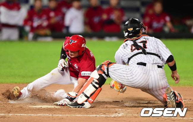 8회초 KIA 공격 무사 2, 3루 상황 신종길의 1타점 좌익수 희생플라이 때 3루주자 김민우가 태그업해 롯데 포수 강민호의 태그를 피해 홈에서 세이프되고 있다.