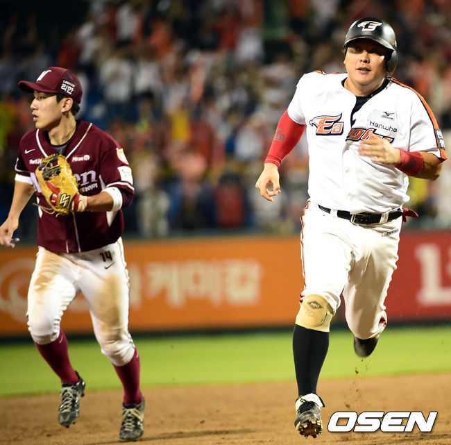 28일 대전야구장에서 벌어진 '2014 한국 야쿠르트세븐 프로야구' 한화 이글스와 넥센 히어로즈의 경기, 7회말 1사 만루 김태완의 2타점 2루타때 1루주자 김태균이 3루로 달리고 있다.