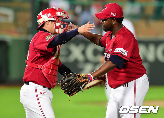 9회말 마운드에 올라 삼자범퇴로 경기를 마무리지은 KIA 투수 어센시오와 포수 이성우가 포옹을 나누고 있다./dreamer@osen.co.kr
