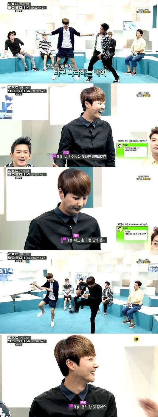 이날 방송에서 카이는 이민우로부터 1분 속성 교육을 받았다. 그러나 평소 댄싱머신인 카이인만큼 빠른 속도로 이를 습득해 감탄을 자아냈다.